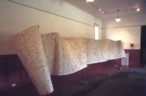 1-16, 259 (front view), pyrography on paper, steel, rocks, 6'x30'x4', exhibit Marking Time at Academy Art Center at Linekona